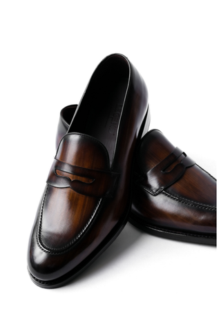 The Chestnut Burnished Penny Loafers exude effortless sophistication and refined craftsmanship. Meticulously handcrafted from premium full-grain leather, these loafers feature a rich chestnut brown tone enhanced by a hand-burnished black gradient, giving each pair a distinctive depth and character.