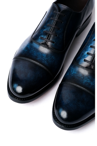 The Midnight Blue Oxford Shoes are a true testament to fine craftsmanship and contemporary elegance. Handcrafted from premium leather, these shoes showcase a deep navy tone enriched with a smoky black patina, giving each pair a unique marbled texture and luxurious depth of color.