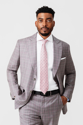 Light Grey with Pink and White Windowpane Pattern(also described as Light Grey Plaid Suit or Soft Grey Check Suit)
