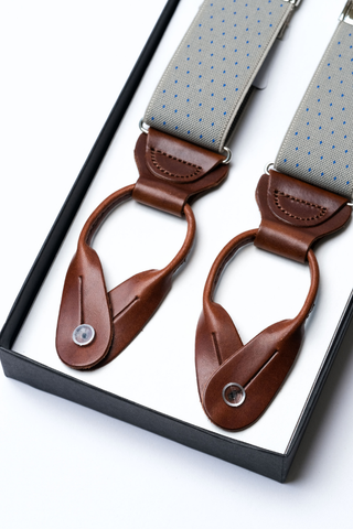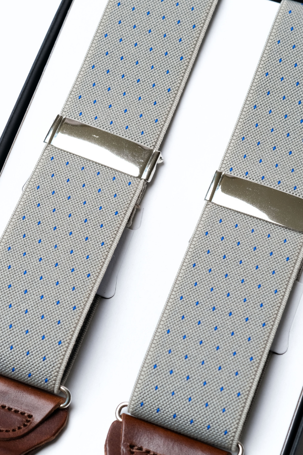 The Ash Grey Dot Leather-End Suspenders exude contemporary sophistication with a timeless touch. Crafted from high-quality elastic fabric in a sleek ash grey tone, these suspenders feature a refined micro polka dot pattern in royal blue, adding subtle contrast and character to any outfit.