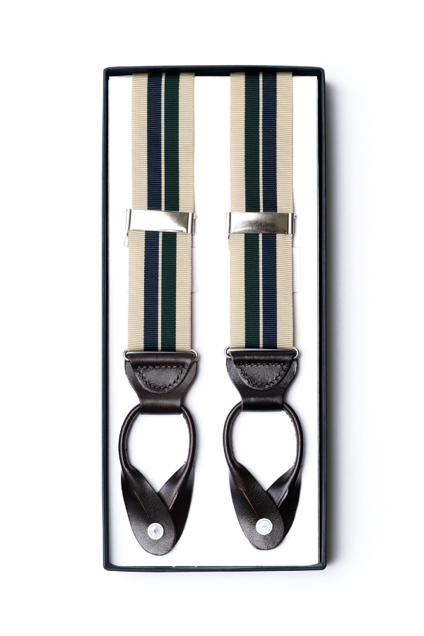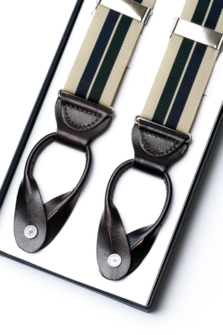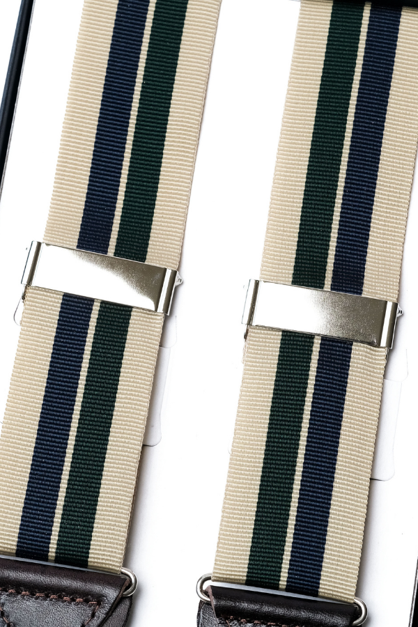 The Heritage Stripe Leather-End Suspenders are a modern nod to classic British tailoring. Expertly crafted from premium elastic fabric in a refined beige base, they feature bold navy blue and forest green vertical stripes, evoking a timeless and distinguished style ideal for both formal and casual ensembles.