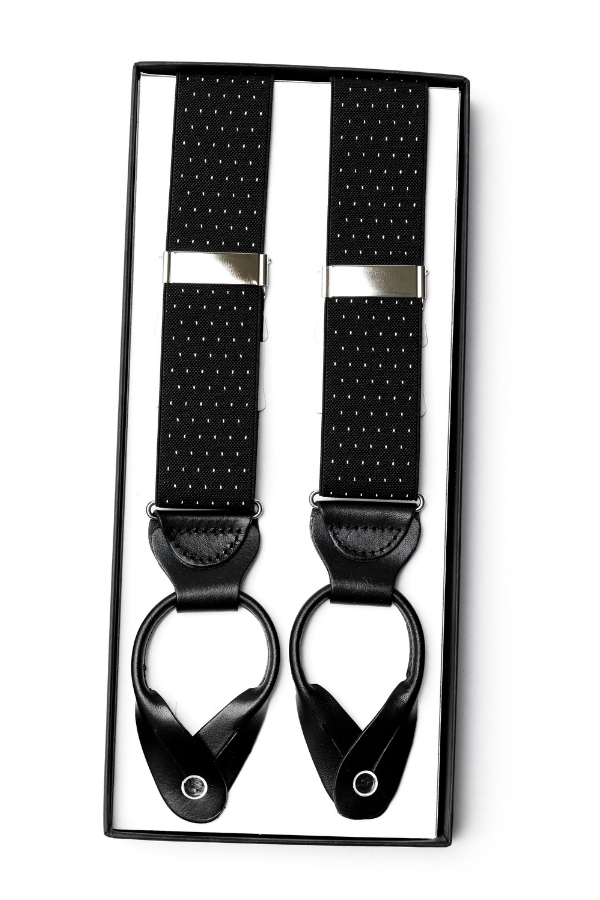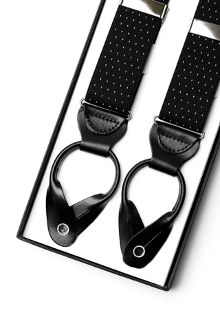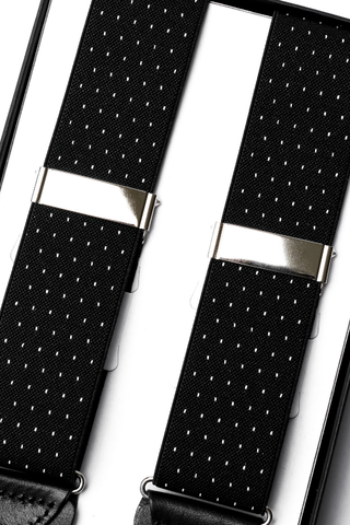The Noir Dot Leather-End Suspenders deliver a refined fusion of classic charm and modern minimalism. Crafted from high-quality elastic fabric in jet black, the design features a subtle micro polka dot pattern woven in crisp white — creating a sophisticated contrast that enhances both formal and semi-formal looks.